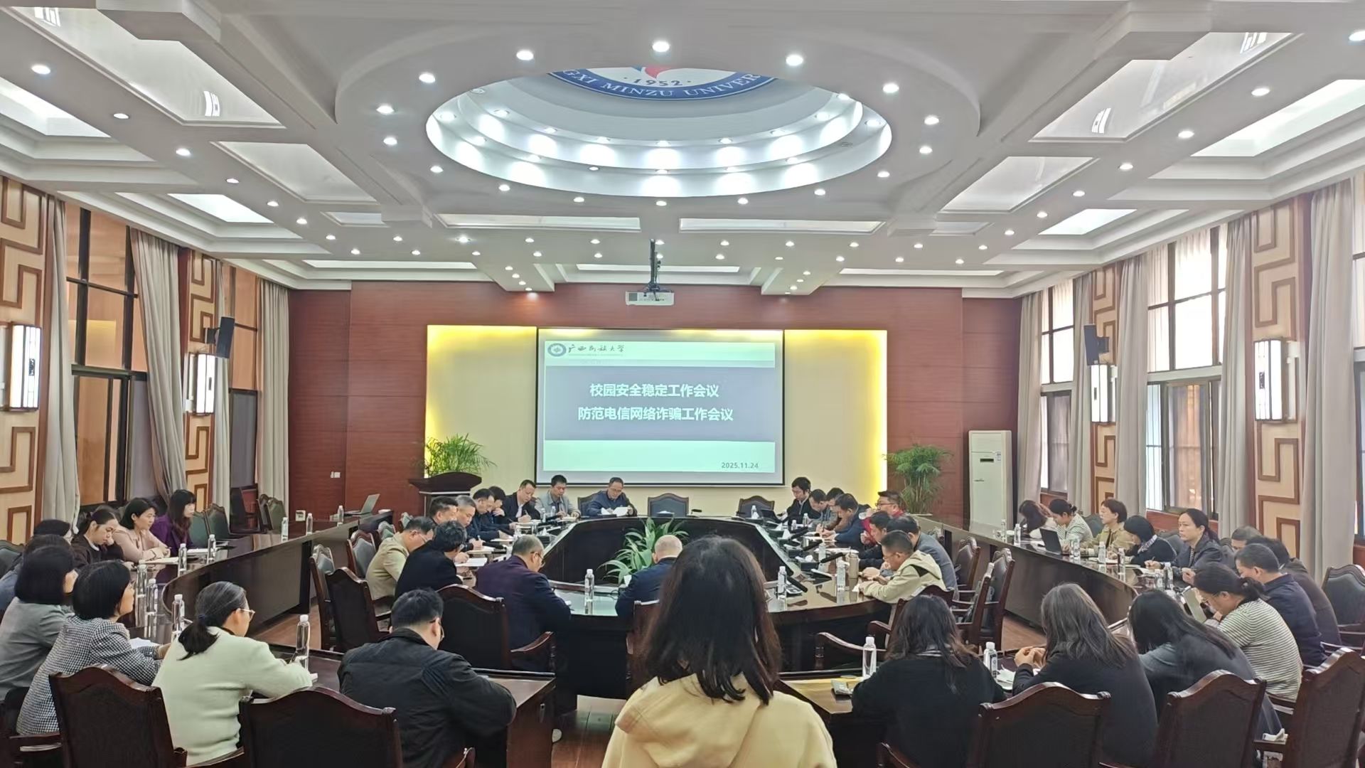 11月24日上午,广西民族大学在国际合作与交流处大会议室召开校园安全稳定工作会议及防范电信网络诈骗工作会议。校党委副书记陈铭彬出席会议,各学院及各职能部门负责安全工作的领导与会。