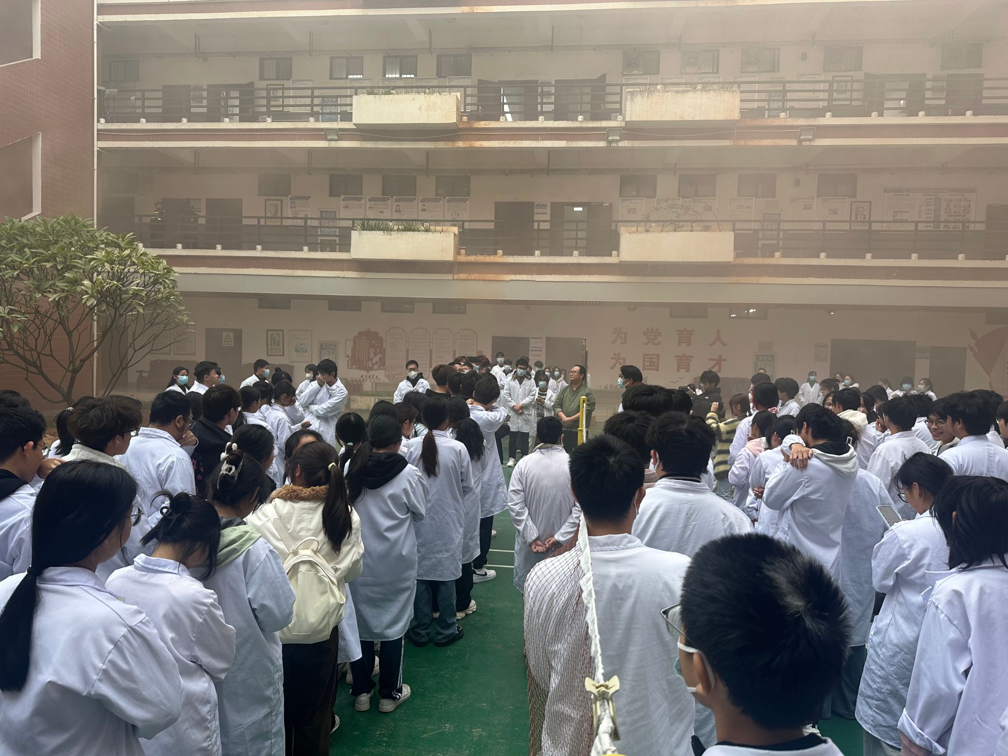 下午5时,演练正式拉开帷幕。保卫处韦东成老师带领工作人员在实验楼楼梯间等关键位置设置了烟雾发生器,模拟真实火灾场景。随着应急警报响起,化工学院实验室管理员及任课教师立即启动应急预案,按照"安全第一、科学施救"的原则,组织学生有序疏散。参演师生弯腰低姿、捂住口鼻,沿着应急指示灯指示方向快速撤离至安全区域。集合清点后,工作人员对现场进行了全面排查,确保无人员滞留。